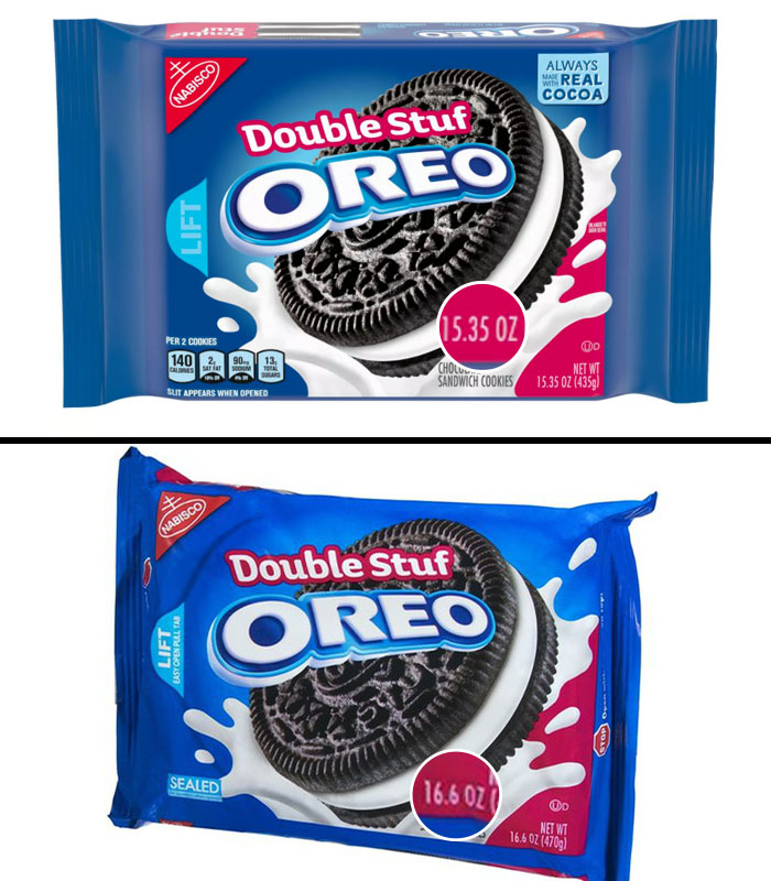 Με τα χρόνια, ένα πακέτο Double Stuf Oreo άλλαξε από 16,6 oz σε 15,35 oz και εξακολουθεί να πωλείται στην ίδια τιμή.
