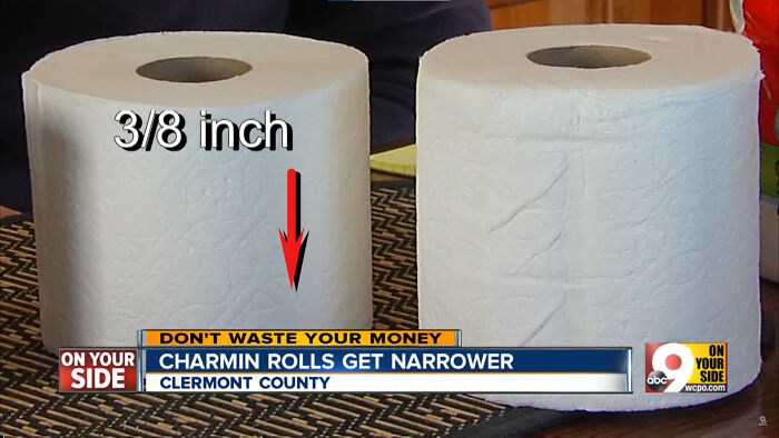 Εδώ και αρκετό καιρό, το μήκος των ρολών χαρτιού τουαλέτας συρρικνώθηκε. Προφανώς, μια φορά και έναν καιρό, το τυπικό μέγεθος ενός ρολού χαρτιού τουαλέτας ήταν 11,5 x 11,5 εκατοστά. Σήμερα, τα περισσότερα ρολά είναι 1,3 εκατοστά μικρότερα από ό, τι στο παρελθόν. Παρ ‘όλα αυτά, οι καταναλωτές εξακολουθούν να πληρώνουν την ίδια τιμή.