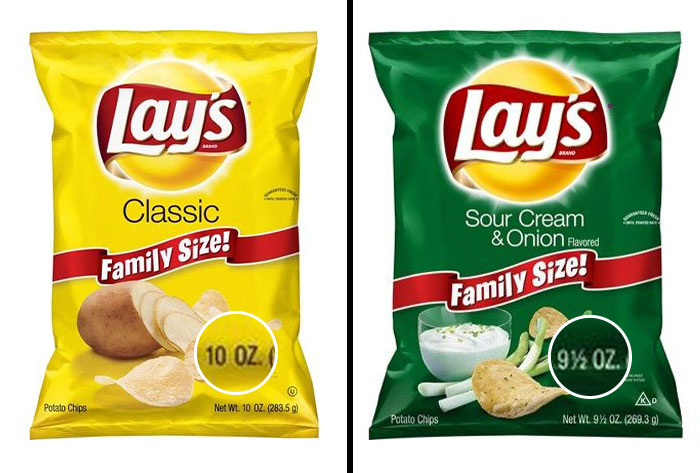 Αποδεικνύεται, ότι μερικές σακούλες πατατάκια Lay´s περιέχουν λιγότερα πατατάκια από άλλες. Τα κανονικά πακέτα των οικογενειακών συσκευασιών Lay΄s είναι 10 oz, αλλά οι συσκευασίες της εταιρείας με γεύσης είναι 9,5 oz, αλλά και οι δύο πωλούνται στην ίδια τιμή. Σύμφωνα με το Associated Press, η διαφορά ισοδυναμεί με περίπου 5-6 πατατάκια.