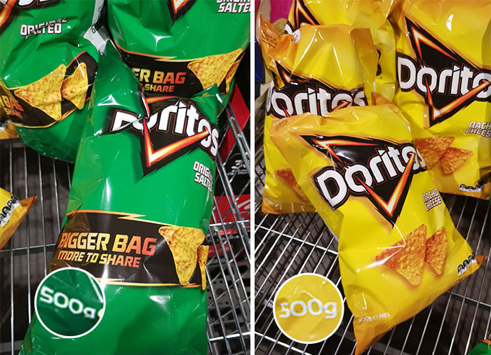 Πέρυσι, κάποιος στο Reddit παρατήρησε πώς ένα πακέτο Doritos “Bigger Bag, More To Share” είχε στην πραγματικότητα την ίδια ποσότητα με το πακέτο κανονικού μεγέθους. «More air To Share», κάποιος αστειεύτηκε στα σχόλια.