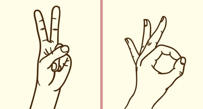 Ταυτόχρονα, κάνετε το σύμβολο για το όλα καλά με δάκτυλα του αριστερού σας χεριού. Στη συνέχεια κάντε το αντίθετο και επαναλάβετε αρκετές φορές.