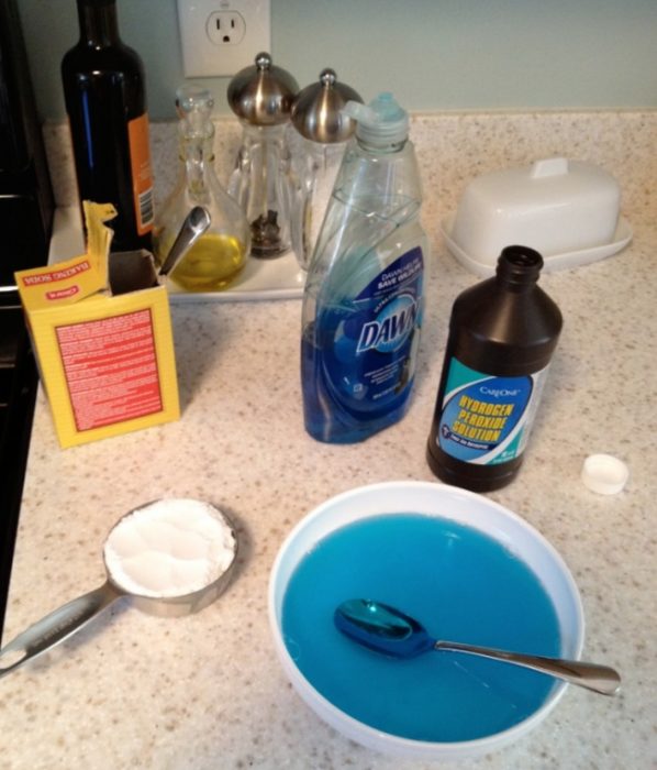 Μείγμα υπεροξειδίου του υδρογόνου (οξυζενέ), μαγειρική σόδα και υγρό πιάτων