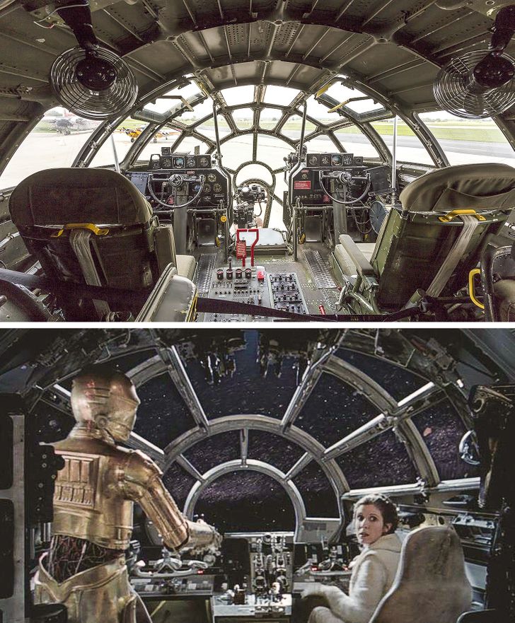 Όταν σχεδίαζε τις διαστημικές μάχες στις ταινίες, ο George Lucas επηρεάστηκε από τις πραγματικές αερομαχίες που πραγματοποιήθηκαν στα μέσα του 20ού αιώνα. Τα περισσότερα από τα σχέδια των διαστημοπλοίων διαμορφώθηκαν σύμφωνα με πραγματικά αεροπλάνα, συμπεριλαμβανομένου του Millennium Falcon, του οποίου το πιλοτήριο είναι σχεδόν πανομοιότυπο με τη μύτη ενός Boeing B-29.
