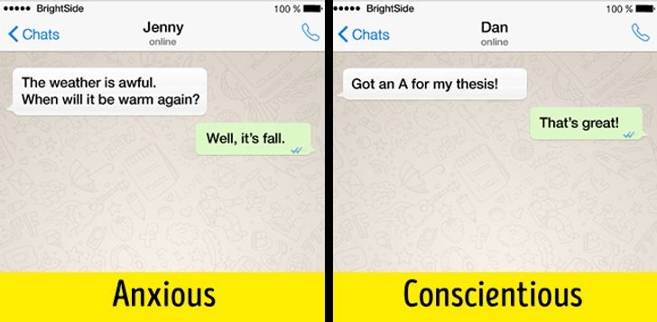 Οι ανήσυχοι και συναισθηματικά ασταθείς άνθρωποι συνήθως χρησιμοποιούν λέξεις που σχετίζονται με αρνητικά συναισθήματα. Οι εξωστρεφείς προτιμούν λέξεις που περιγράφουν θετικά συναισθήματα. Οι συνειδητοί άνθρωποι χρησιμοποιούν λέξεις που σχετίζονται με επιτεύγματα πιο συχνά, και οι ανοιχτοί άνθρωποι συνήθως επιλέγουν εξελιγμένες λέξεις και φράσεις όπου κάποιος θα έλεγε πιο συνοπτικά.
