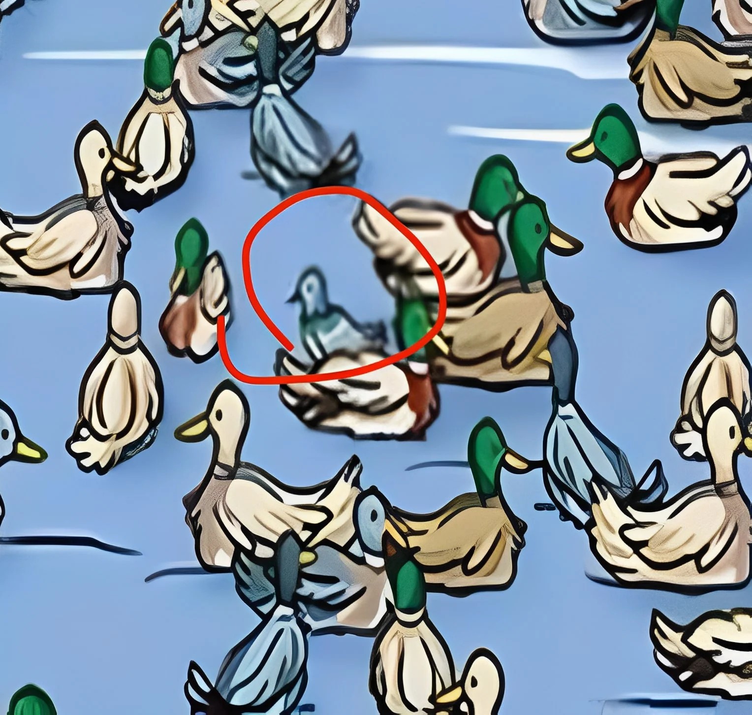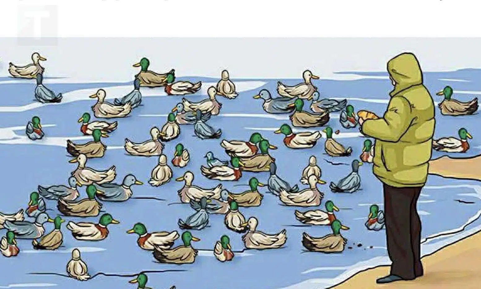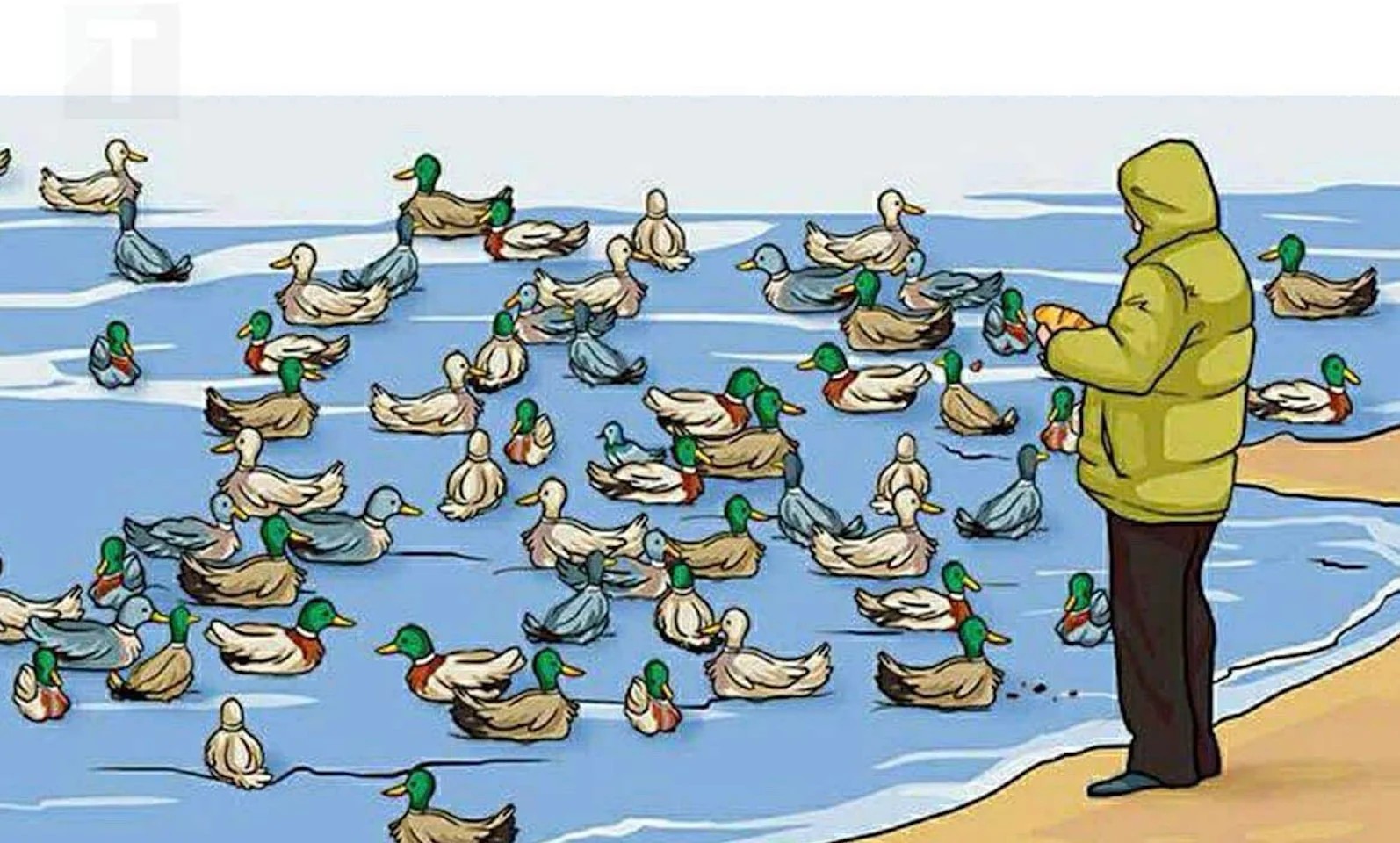 Στην πρώτη ματιά, βλέπουμε έναν άνθρωπο με κίτρινο μπουφάν να στέκεται στην άκρη μιας λίμνης, ταΐζοντας πάπιες που κολυμπούν στο νερό. Όλα φαίνονται φυσιολογικά, όμως αν παρατηρήσει κανείς προσεκτικά, θα διαπιστώσει ότι κάτι δεν ταιριάζει στη σκηνή.