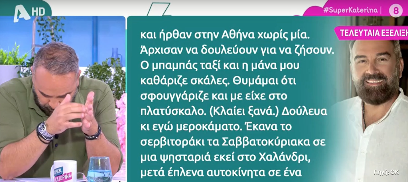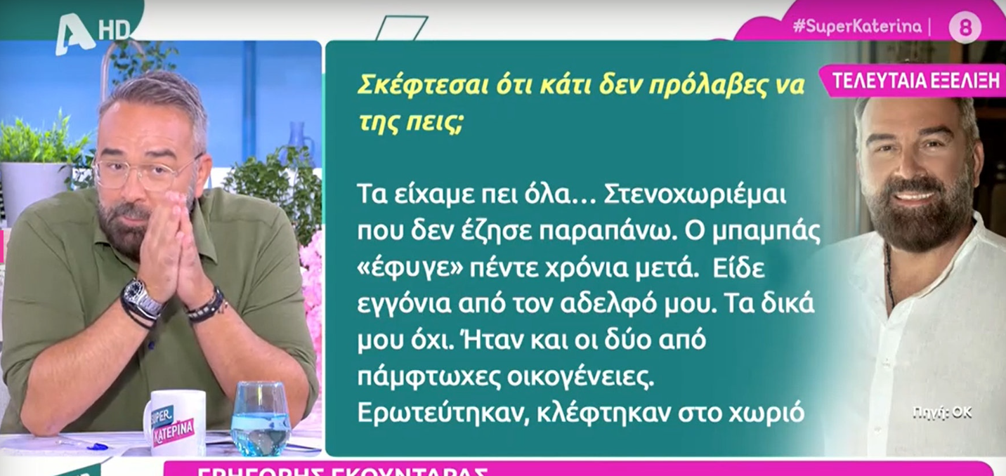 Ο Γρηγόρης Γκουντάρας συμμετείχε σε μια συγκινητική στιγμή στην εκπομπή “Super Κατερίνα!” καθώς προβλήθηκε ένα απόσπασμα από τη συνέντευξή του στο περιοδικό ΟΚ!. Κατά τη διάρκεια αυτού του αποσπάσματος, μίλησε για το μωρό που χάθηκε με τη Ναταλί Κάκκαβα, αλλά και για τον θάνατο των γονιών του.