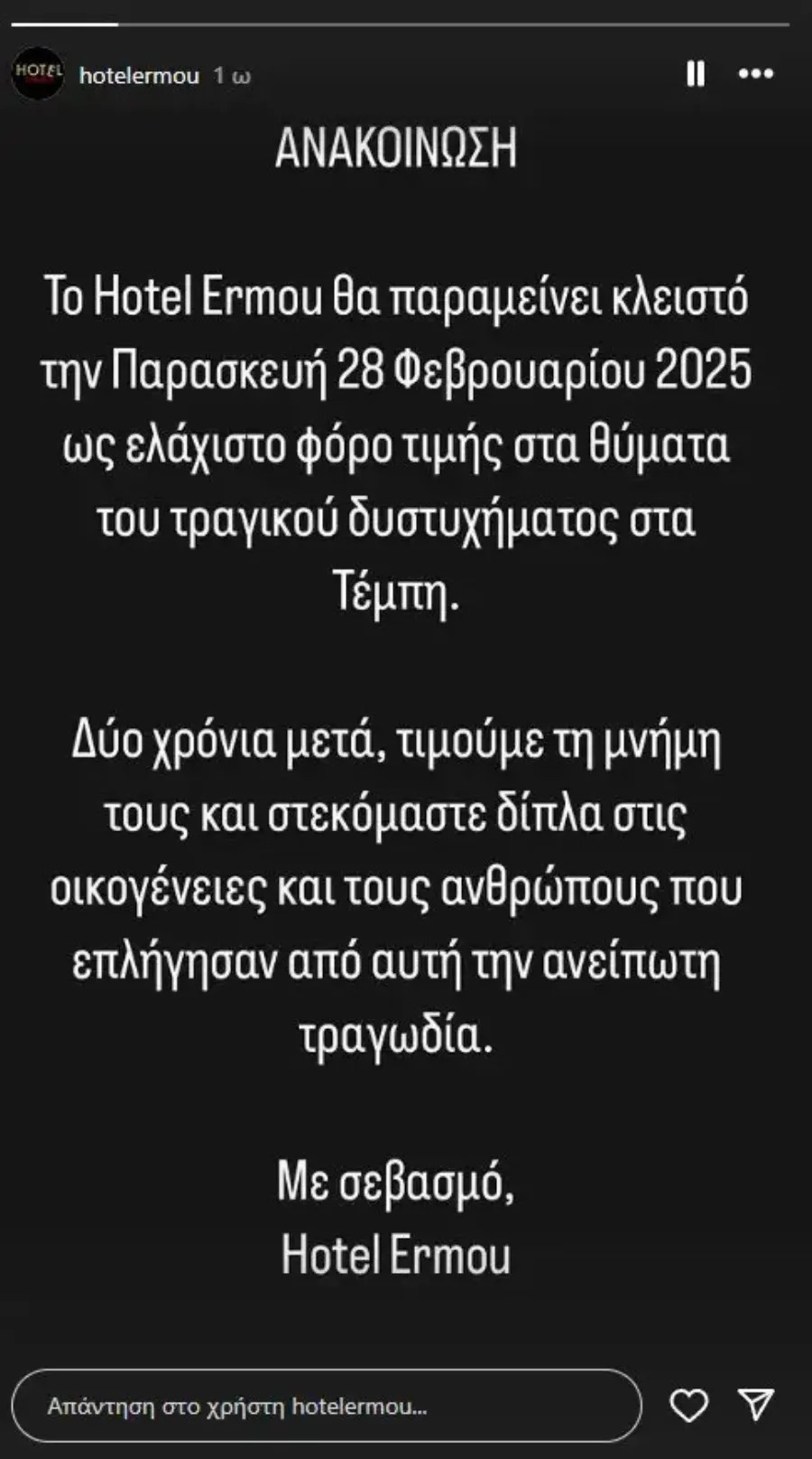 Όπως αναφέρει η ανακοίνωση του νυχτερινού κέντρου: «Το Hotel Ermou θα παραμείνει κλειστό την Παρασκευή 28 Φεβρουαρίου 2025 ως ελάχιστο φόρο τιμής στα θύματα του τραγικού δυστυχήματος στα Τέμπη.