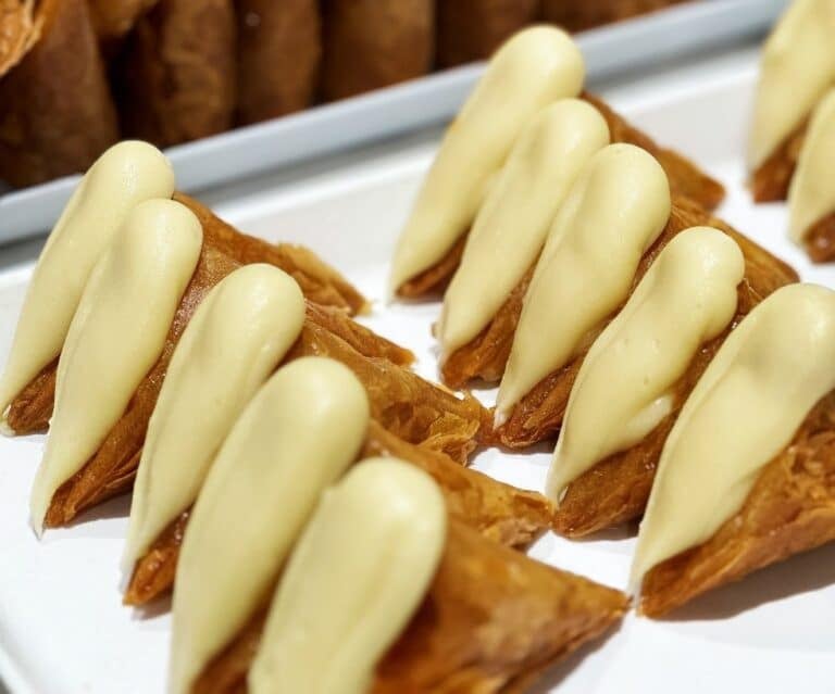 Τα τρίγωνα από φύλλο ψήνονται μέχρι να ροδίσουν, βυθίζονται σε κρύο σιρόπι που αποτελείται από ζάχαρη και νερό και στη συνέχεια γεμίζονται με την κρύα κρέμα. Τα τρίγωνα συχνά γαρνίρονται με ψιλοκομμένους ξηρούς καρπούς πριν από την κατανάλωσή τους», περιγράφει το Taste Atlas.