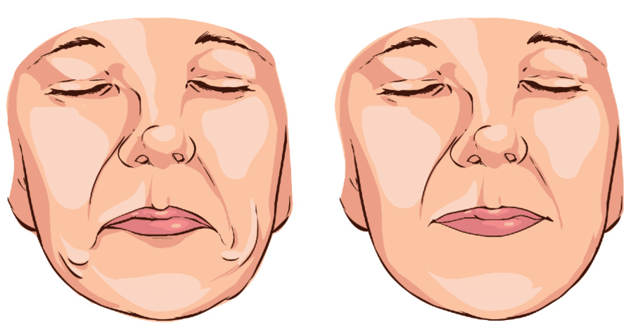• Στα μάγουλα, με περισσότερο εμφανή σημεία τα άκρα της κάτω σιαγόνας. Τα μάγουλα φαίνονται «πεσμένα» και χαλούν εντελώς το σχήμα του προσώπου, καθώς επιδεικνύουν μερικές φορές τους κύκλους κάτω από τα μάτια και τονίζουν πάρα πολύ τις ρυτίδες έκφρασης.