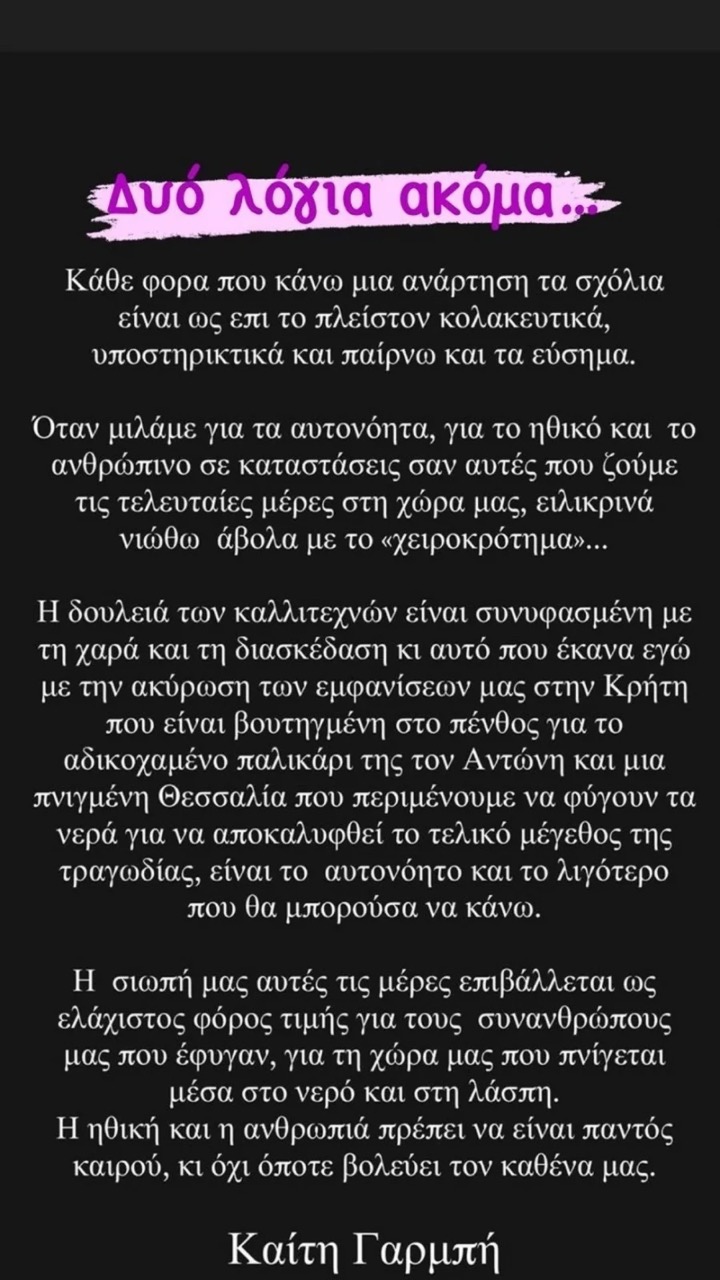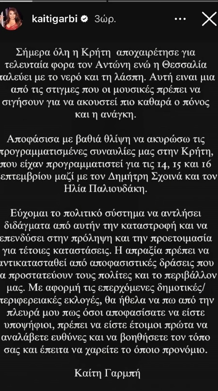 Με την ανάρτησή της, η Καίτη Γαρμπή ανακοίνωσε ότι αποφάσισε να αναβάλει όλες τις επαγγελματικές της δραστηριότητες και τη συναυλία της στην Κρήτη, εκφράζοντας το θυμό και τη θλίψη της για τα τραγικά γεγονότα που συνέβησαν, ειδικά μετά την άδικη δολοφονία του 36χρονου Αντώνη Καρυώτη. Ακόμα η γνωστή καλλιτέχνης επέστησε την προσοχή στην ανάγκη για αλληλεγγύη και δράση από τους δημάρχους και τους Περιφερειάρχες, προκειμένου να βοηθήσουν τον κόσμο που έχει πληγεί από τις καταστροφές, προτρέποντάς τους να βάλουν το συμφέρον του κοινού πάνω από οποιοδήποτε προνόμιο.