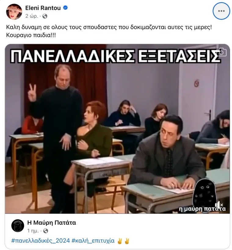 «Καλή δύναμη σε όλους τους σπουδαστές που δοκιμάζονται αυτές τις μέρες! Κουράγιο παιδιά!!!», έγραψε η Ελένη Ράντου στην ανάρτησή της.