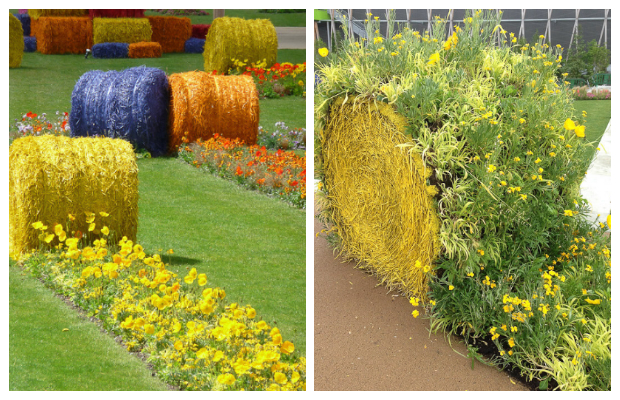 Ένας ακόμη τρόπος για να χρησιμοποιήσετε τις αχυρόμπαλες στην διαμόρφωση ενός κήπου είναι να τους δώσετε όψη σαν να είναι …φυτεμένες. Θα το κάνετε με τον βοήθεια 3-4 μέτρων έτοιμου φυσικού χλοοτάπητα σκορπώντας μέσα στο γκαζόν σπόρους φυτών χαμηλής ανάπτυξης κατάλληλα για εδαφοκάλυψη. Στο σημείο που θα τελειώνει ο χλοοτάπητας, αφού καλύψει περιμετρικά την μπάλα, διαμορφώστε για μερικά ακόμη μέτρα ένα παρτέρι φυτεμένο με ίδια φυτά.