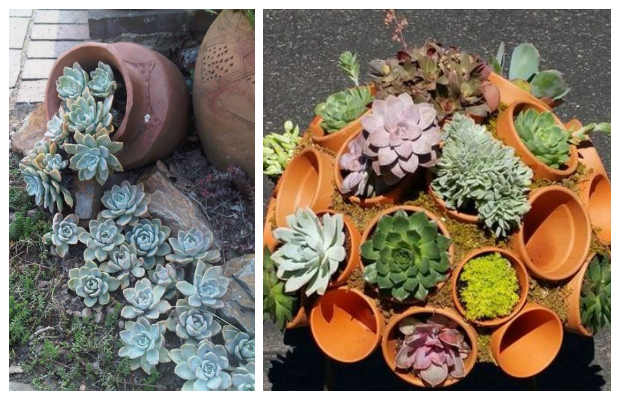 Τα παχύφυτα είναι ιδιαίτερα ταιριαστά με πήλινες γλάστρες – πιθάρια στα οποία μπορούν να φυτευτούν και με τρόπο που να δίνουν την εντύπωση ότι βγαίνουν και …απλώνονται στο έδαφος από την γλάστρα.