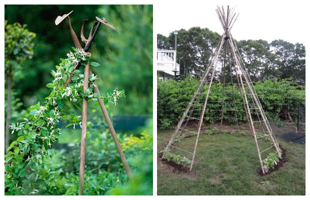 Απλός αλλά εξαιρετικά εντυπωσιακός σε αποτέλεσμα τρόπος για να στηρίξετε αναρριχώμενα καλλωπιστικά αλλά και λαχανικά. Σχηματίστε με ξύλα ή και χοντρά καλάμια μια “πυραμίδα” και φυτέψτε τα φυτά με τρόπο που αναπτυσσόμενα να στηρίζονται σε αυτήν. Η διάμετρος της κατασκευής εξαρτάται από τον αριθμό και το είδος των φυτών που θα χρησιμοποιήσετε.