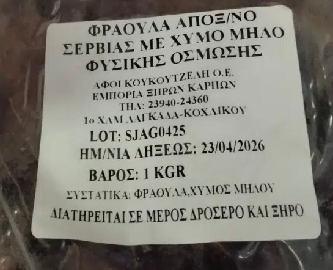 Ωστόσο στη συσκευασία του προϊόντος «Φράουλα αποξηραμένη με χυμό μήλου φυσικής όσμωσης», προέλευσης Σερβίας, σε πλαστική κλειστή συσκευασία 1 kg, με αριθμό παρτίδας SJAG0425 και ανάλωση κατά προτίμηση πριν από 23/04/2026, το οποίο διατίθεται από την επιχείρηση «ΑΦΟΙ ΚΟΥΚΟΥΤΖΕΛΗ Ο.Ε.» με έδρα στον 1ο χλμ. Λαγκαδά–Κολχικούmg/kg, δεν αναγράφεται η ουσία θειώδη η οποία είναι αλλεργιογόνος, ενώ θα έπρεπε να τονίζεται με είδος χαρακτήρων που κάνει σαφή διάκριση από το υπόλοιπο του καταλόγου των συστατικών.