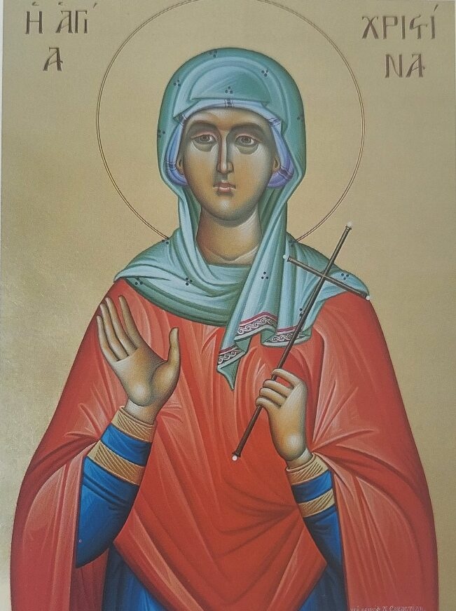 Η Αγία Χριστίνα η Μεγαλομάρτυς υπήρξε μία από τις σημαντικότερες μορφές της πρωτοχριστιανικής περιόδου και αποτελεί σύμβολο ακλόνητης πίστης και θάρρους στην ορθόδοξη παράδοση. Γεννημένη περίπου το 200 μ.Χ. στην Τύρο της Συρίας, ήταν κόρη του στρατηγού Ουρβανού, μεγαλωμένη σε ειδωλολατρικό περιβάλλον και κατοικούσε σε πύργο που της είχε χτίσει ο πατέρας της, γεμάτο με χρυσά και αργυρά είδωλα, με σκοπό να γίνει ιέρεια των ειδώλων. Όμως, η ίδια, οδηγούμενη από τη χάρη του Θεού και με παρέμβαση αγγέλου, κατέστρεψε τα είδωλα, μοιράζοντας τα πολύτιμα υλικά στους φτωχούς και κηρύσσοντας με θάρρος την πίστη της στον Χριστό.