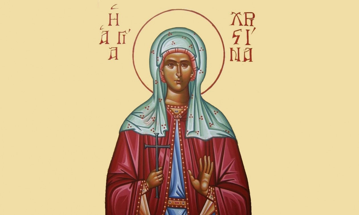 Η Αγία Χριστίνα η Μεγαλομάρτυς υπήρξε μία από τις σημαντικότερες μορφές της πρωτοχριστιανικής περιόδου και αποτελεί σύμβολο ακλόνητης πίστης και θάρρους στην ορθόδοξη παράδοση. Γεννημένη περίπου το 200 μ.Χ. στην Τύρο της Συρίας, ήταν κόρη του στρατηγού Ουρβανού, μεγαλωμένη σε ειδωλολατρικό περιβάλλον και κατοικούσε σε πύργο που της είχε χτίσει ο πατέρας της, γεμάτο με χρυσά και αργυρά είδωλα, με σκοπό να γίνει ιέρεια των ειδώλων. Όμως, η ίδια, οδηγούμενη από τη χάρη του Θεού και με παρέμβαση αγγέλου, κατέστρεψε τα είδωλα, μοιράζοντας τα πολύτιμα υλικά στους φτωχούς και κηρύσσοντας με θάρρος την πίστη της στον Χριστό.