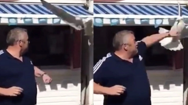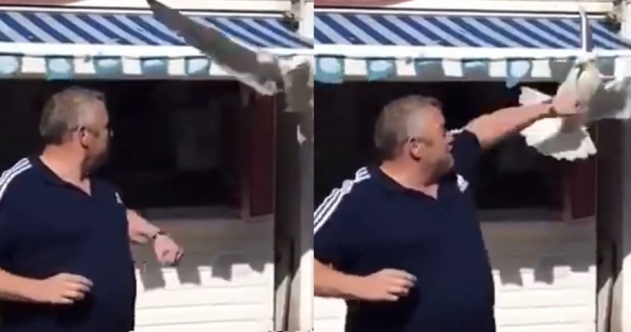 Ο άντρας γρήγορα δίνει μια μπουνιά στην κοιλιά του πουλιού – αναγκάζοντας το γλάρο να πετάξει μακριά.