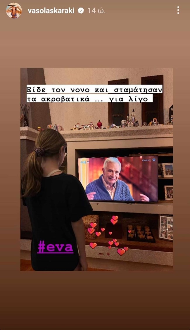 Να θυμίσουμε εδώ πως το βράδυ της Πέμπτης, η η Βάσω Λασκαράκη απαθανάτισε την κόρη της Εύα να βλέπει τηλεόραση απολαμβάνοντας τον νονό της, Αλέξανδρο Αντωνόπουλο στην τηλεόραση. Η μικρή Εύα Τσιμιτσέλη, η κόρη της Βάσως Λασκαράκη, μοιάζει εκπληκτικά με τη μητέρα της. Το καστανόξανθο μαλλί και το φωτεινό της χαμόγελο, μαζί με τα σκιστά μάτια της, κάνουν την ομοιότητά τους ακαταμάχητη. “Είδε τον νονό και σταμάτησαν τα ακροβατικά για λίγο”, έγραψε η αγαπημένη ηθοποιός.