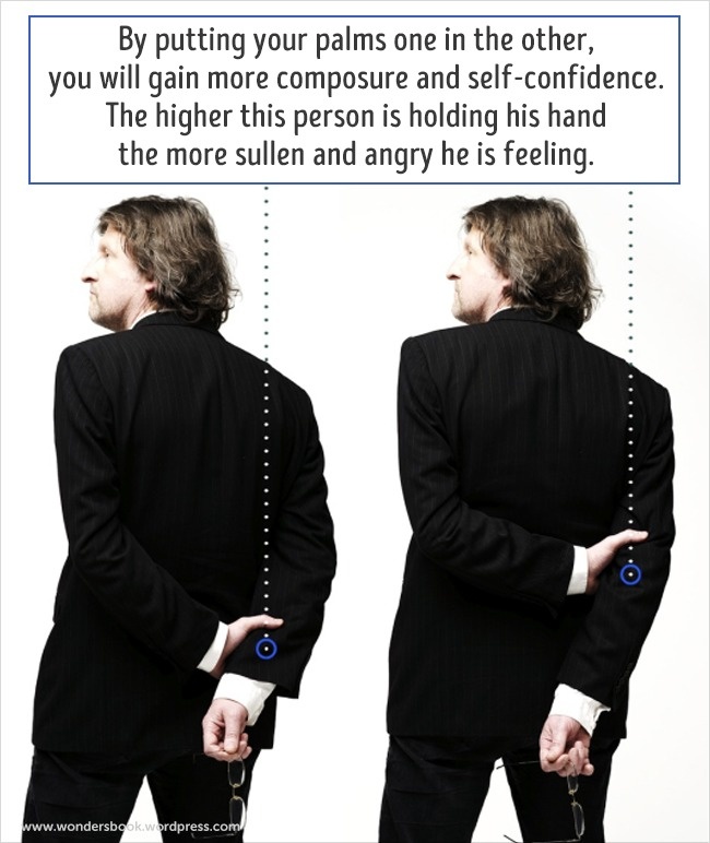 Βάζοντας τις παλάμες την μία πάνω από την άλλη, θα έχετε μεγαλύτερη ψυχραιμία και αυτοπεποίθηση. Όσο πιο ψηλά τα χέρια, τόσο πιο θυμωμένος θα φαίνεστε.