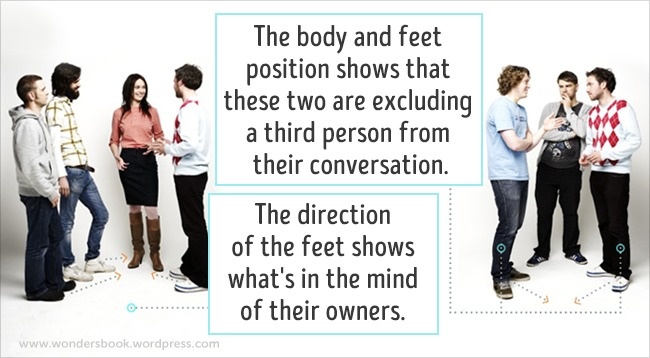 Το σώμα και τα πόδια αυτών των δύο δείχνουν πως αποκλείουν το τρίτο πρόσωπο από την κουβέντα τους. Η κατεύθυνση των ποδιών κάποιου δείχνουν τι έχει στο μυαλό του.