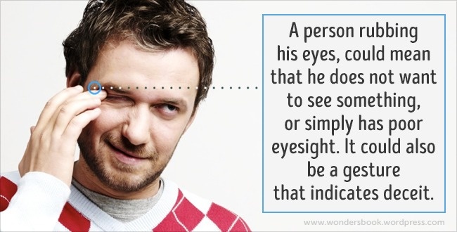 Όταν κάποιος τρίβει το μάτι του, αυτό θα μπορούσε να σημαίνει πως δεν θέλει να δει κάτι ή πως απλά δεν έχει καλή όραση. Επίσης, θα μπορούσε να δείχνει απάτη.