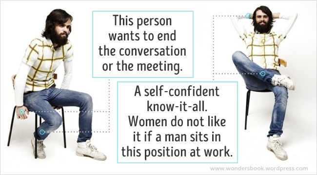 Αυτός ο τύπος θέλει να σταματήσει την συζήτηση ή την συνάντηση. – Ενώ έτσι δείχνει πως έχει αυτοπεποίθηση. Οι γυναίκες δεν θέλουν ο άντρας να κάθεται έτσι στην δουλειά.