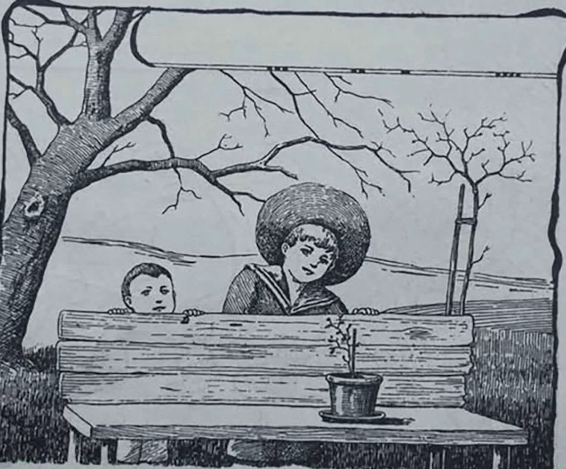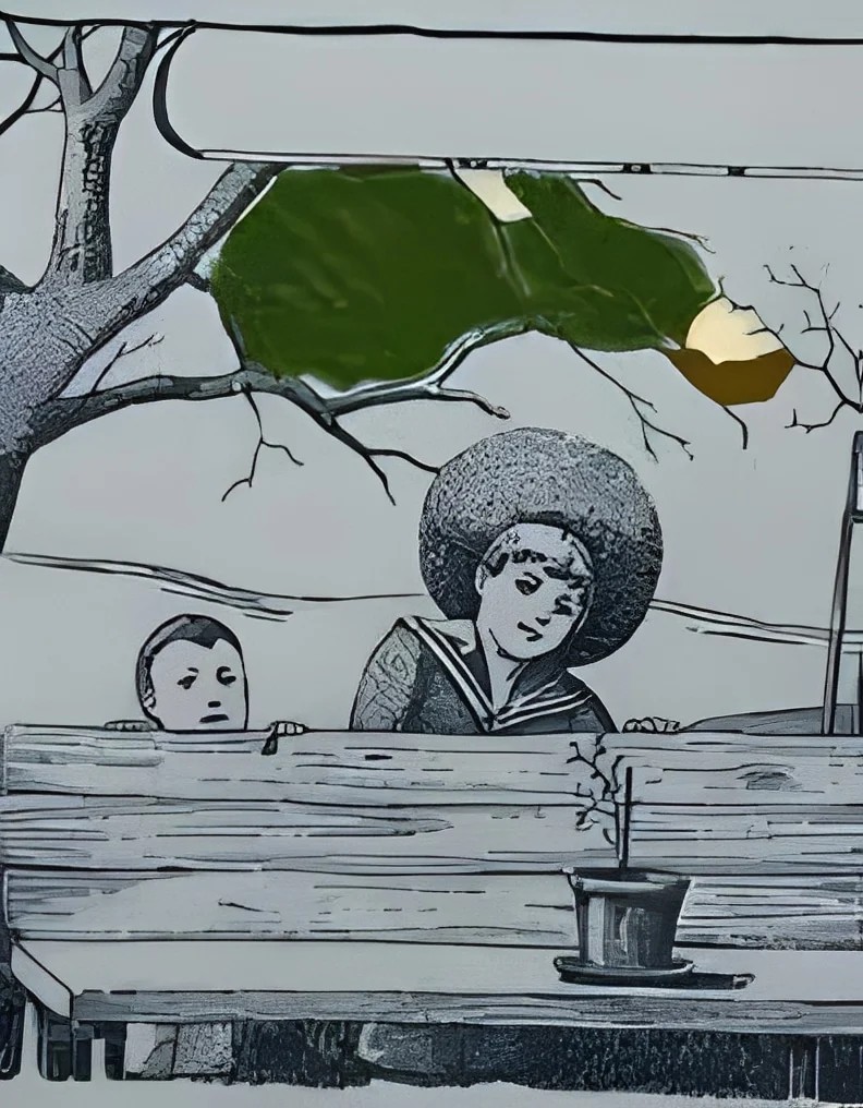 Η μητέρα δεν εμφανίζεται ως ξεχωριστή φιγούρα. Το πρόσωπό της σχηματίζεται από ολόκληρη τη σκηνή. Τα κλαδιά του δέντρου, το σχήμα του παγκακιού, η θέση των παιδιών — όλα συνδυάζονται για να δημιουργήσουν ένα γυναικείο πρόσωπο που σε κοιτάζει κατάματα. Μόλις το δεις, γίνεται αδύνατο να το “ξεδείς”.