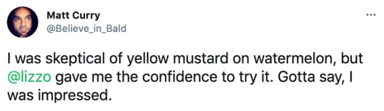 «Ήμουν σκεπτικός για την κίτρινη μουστάρδα στο καρπούζι, αλλά η @lizzo μου έδωσε την σιγουριά που χρειαζόμουν για να το δοκιμάσω. Πρέπει να πω ότι με εντυπωσιάστηκα.»