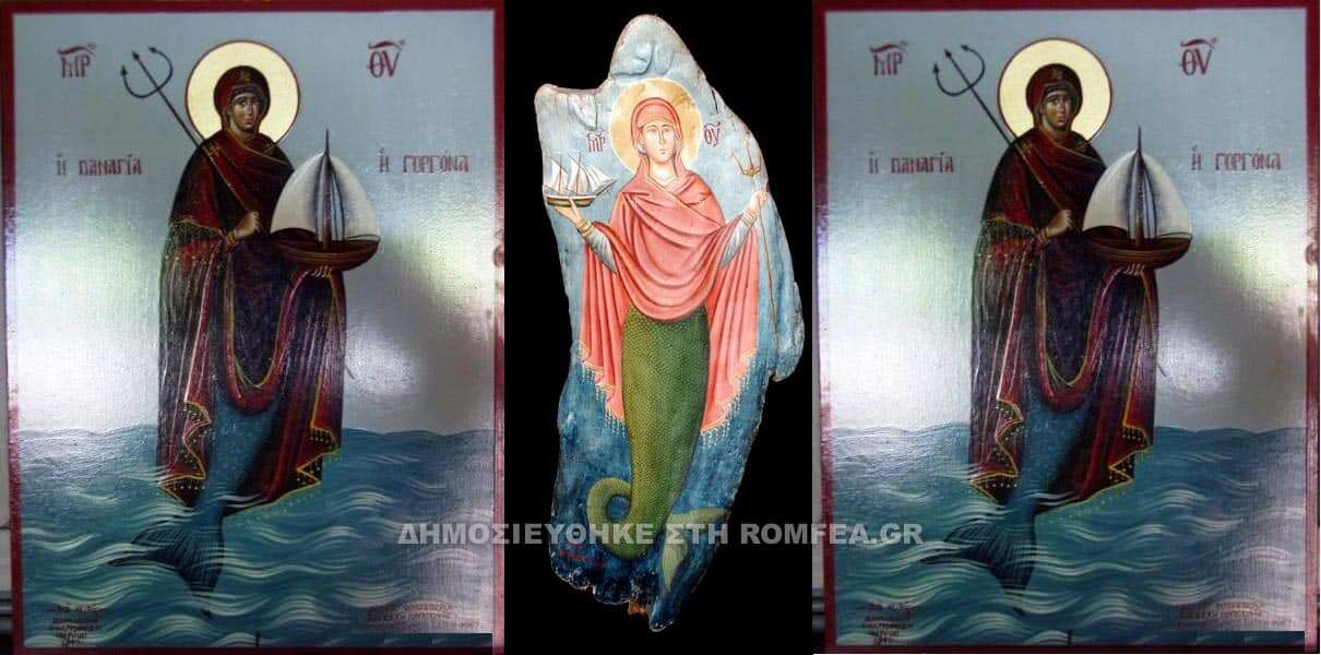 Η Παναγιά Γοργόνα, μια από τις πιο ασυνήθιστες και συνάμα ποιητικές απεικονίσεις της Παναγίας στον ελληνικό χώρο, έχει τις ρίζες της βαθιά στη λαϊκή φαντασία και την τοπική παράδοση της Λέσβου. Αν και το όνομα έγινε ευρύτερα γνωστό από το ομώνυμο μυθιστόρημα του Στρατή Μυριβήλη, η προέλευσή του εντοπίζεται σε ένα μικρό παραθαλάσσιο εκκλησάκι που στέκει πάνω σε βράχο, στο λιμανάκι της Σκάλας Συκαμινιάς, συνδυάζοντας την ορθόδοξη εικονογραφία με τους μυθικούς θρύλους των ψαράδων του Αιγαίου.