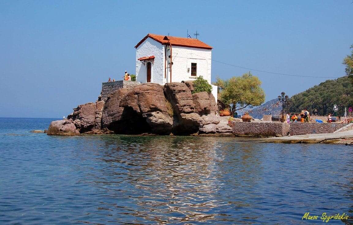 Ο Στρατής Μυριβήλης στο έργο του περιγράφει: «Κατάμπροστα στο ψαραδολίμανο, μέσα στο μάτι του πουνέντη, ορθώνεται πάνω σε θεώρατη θαλασσοβραχιά το ξωκλήσι της Παναγιάς της Γοργόνας», αποκαλύπτοντας την έμπνευσή του από μια σπάνια τοιχογραφία που κοσμεί το εσωτερικό του ναού.