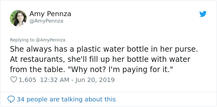 «Πάντα κουβαλάει ένα πλαστικό μπουκάλι με νερό στη τσάντα της. Στα εστιατόρια ξαναγεμίζει το μπουκάλι από το τραπέζι. Γιατί όχι; Αφού το πληρώνω.»