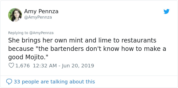 «Φέρνει τη δικιά της μέντα και λάιμ στα εστιατόρια επειδή δεν ξέρουν να φτιάχνουν ένα καλό μοχίτο.»