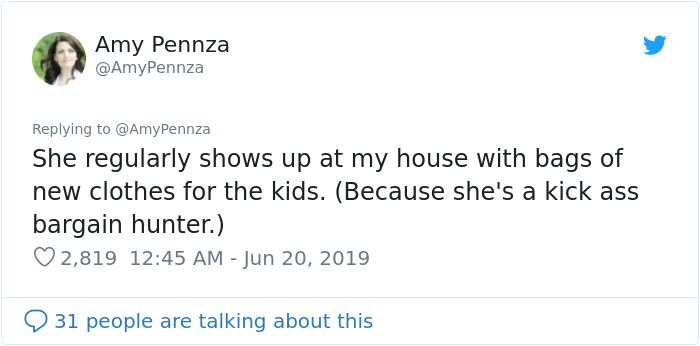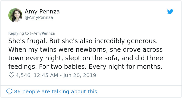 «Είναι τρομερά οικονόμα. Αλλά και είναι εκπληκτικά γενναιόδωρη. Όταν τα δίδυμά μου ήταν νεογέννητα, οδηγούσε κάθε βράδυ στην πόλη, κοιμόταν στον καναπέ και έκανε τρία ταΐσματα. Για δύο μωρά. Κάθε μέρα για μήνες.»