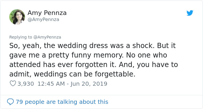 «Έτσι λοιπόν ναι, το νυφικό της ήταν ένα σοκ. Αλλά μου χάρισε μια αρκετά αστεία ανάμνηση. Κανένας προσκεκλημένος δεν το έχει ξεχάσει. Και πρέπει να το παραδεχτείτε, οι γάμοι εύκολα ξεχνιούνται.»