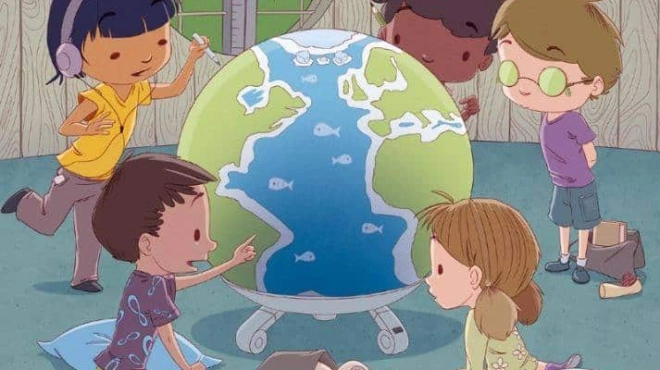 Στην εικόνα φαίνεται μία παρέα παιδιών που παίζουν με μία υδρόγειο και κάπου στην εικόνα είναι κρυμμένη μία μπανάνα, την οποία πρέπει να βρουν οι λύτες σε 6 δευτερόλεπτα.