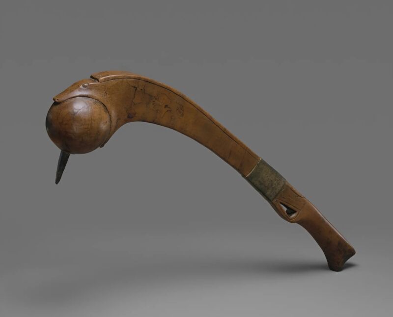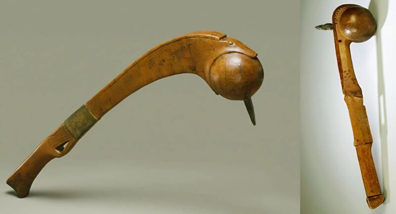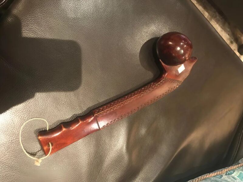 Ήταν φτιαγμένο από σκούρο ξύλο, διακοσμημένο με ανάγλυφα σχέδια και είχε μια μαζική σφαίρα στη μία άκρη.