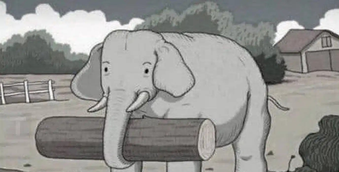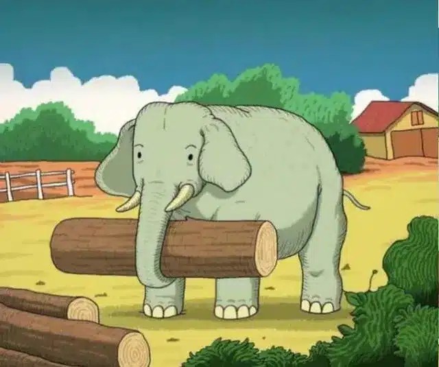 Ένας ελέφαντας στέκεται στο προσκήνιο, ένα μικρό σπίτι βρίσκεται ήσυχα στο φόντο και η σκηνή δείχνει ήρεμη και απλή.