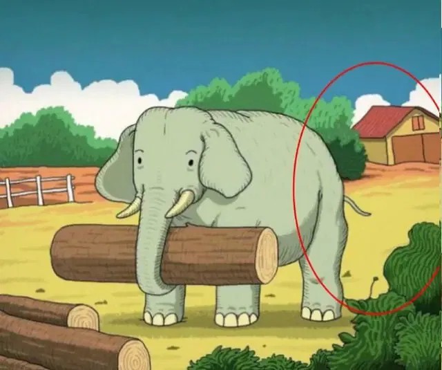 Αντίθετα, η σιλουέτα του εμφανίζεται στο έδαφος ανάμεσα στο πίσω αριστερό πόδι του ελέφαντα και τη βλάστηση κοντά στο σπίτι. Οι γύρω σκιές και γραμμές δημιουργούν το μακρόστενο περίγραμμα του κεφαλιού και του σώματος ενός αλόγου.