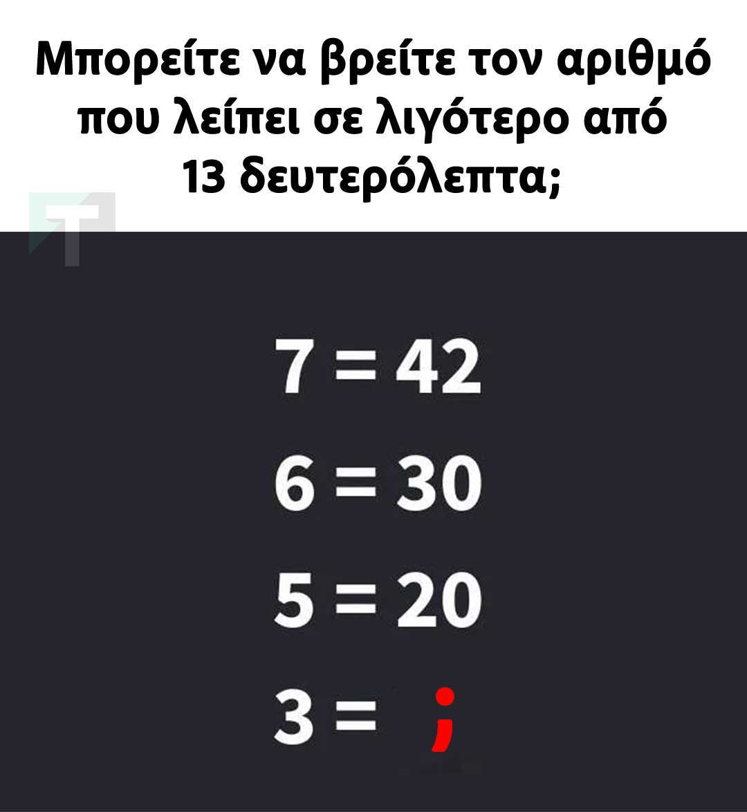 Εάν λύσετε το συγκεκριμένο τεστ IQ σε λιγότερο από 13 δευτερόλεπτα τότε έχετε υψηλό IQ. Το παζλ σας ζητάει να καταλάβετε το μοτίβο και να βρείτε ποιος αριθμός λείπει.