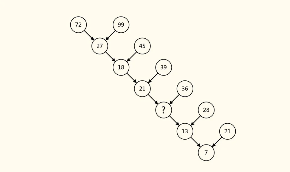 Ξεκινώντας από το αρχικό σημείο στο επάνω αριστερό μέρος του γρίφου, εντοπίζουμε δύο αριθμούς: το 99 και το 72. Από τους κύκλους που περιλαμβάνουν αυτούς τους αριθμούς, υπάρχουν ξεχωριστά βέλη που κατευθύνονται προς έναν τρίτο κύκλο, όπου βρίσκεται ο αριθμός 27. Στη συνέχεια, αυτό το βέλος οδηγεί σε έναν άλλο κύκλο που περιλαμβάνει τον αριθμό 18. Στο δεξί μέρος, ένας επιπλέον κύκλος με τον αριθμό 45 δείχνει προς τον ίδιο κύκλο που περιέχει τον αριθμό 18.