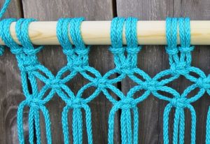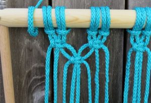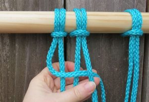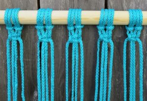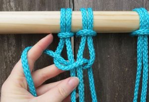 Στην επόμενη σειρά κάνετε τον ίδιο κόμπο αλλά ξεκινάτε με το τρίτο κορδόνι. Θα χρησιμοποιείτε δύο κομμάτια από κάθε πλευρά. Όταν τα δένετε μαζί, φροντίστε να φαίνονται ίσα. Συνεχίστε μέχρι το τέλος.