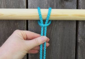 Χρησιμοποιώντας το κορδόνι 1/4 ιντσών, κόψτε 16 κομμάτια των 8 μέτρων. Ακούγεται πολύ, αλλά όσο περισσότερο δένετε τους κόμπους, τόσο το κορδόνι μικραίνει. Πάρτε ένα κορδόνι, διπλώστε το στη μέση. Περάστε το στο πλαίσιο και περάστε τις άκρες μέσα από τη θηλεια. Επαναλάβετε και με τα 16 κομμάτια. Στο τέλος θα πρέπει να έχετε 32 κορδόνια.