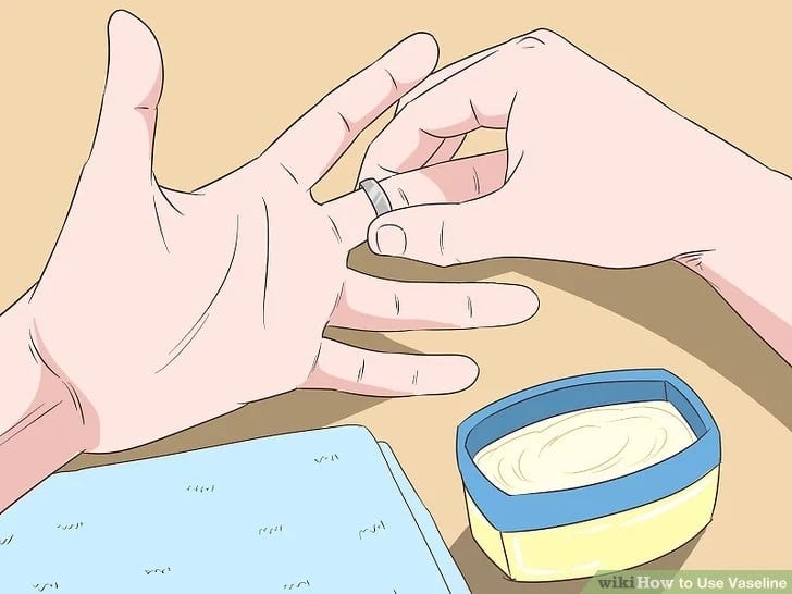 Η βαζελίνη είναι ένα αποτελεσματικό λιπαντικό. Απλώς εφαρμόστε μια μικρή ποσότητα γύρω από τις άκρες του δακτυλιδιού και στρίψτε το απαλά —αυτό θα τον βοηθήσει να γλιστράει εύκολα. Μερικοί άνθρωποι χρησιμοποιούν επίσης βαζελίνη στους λοβούς των αυτιών τους τακτικά, καθώς κάνει την τοποθέτηση των σκουλαρίκια πιο ομαλή και πιο άνετη.
