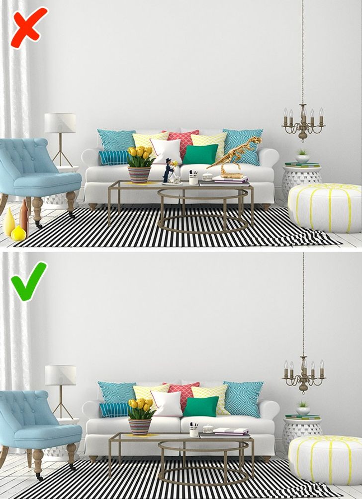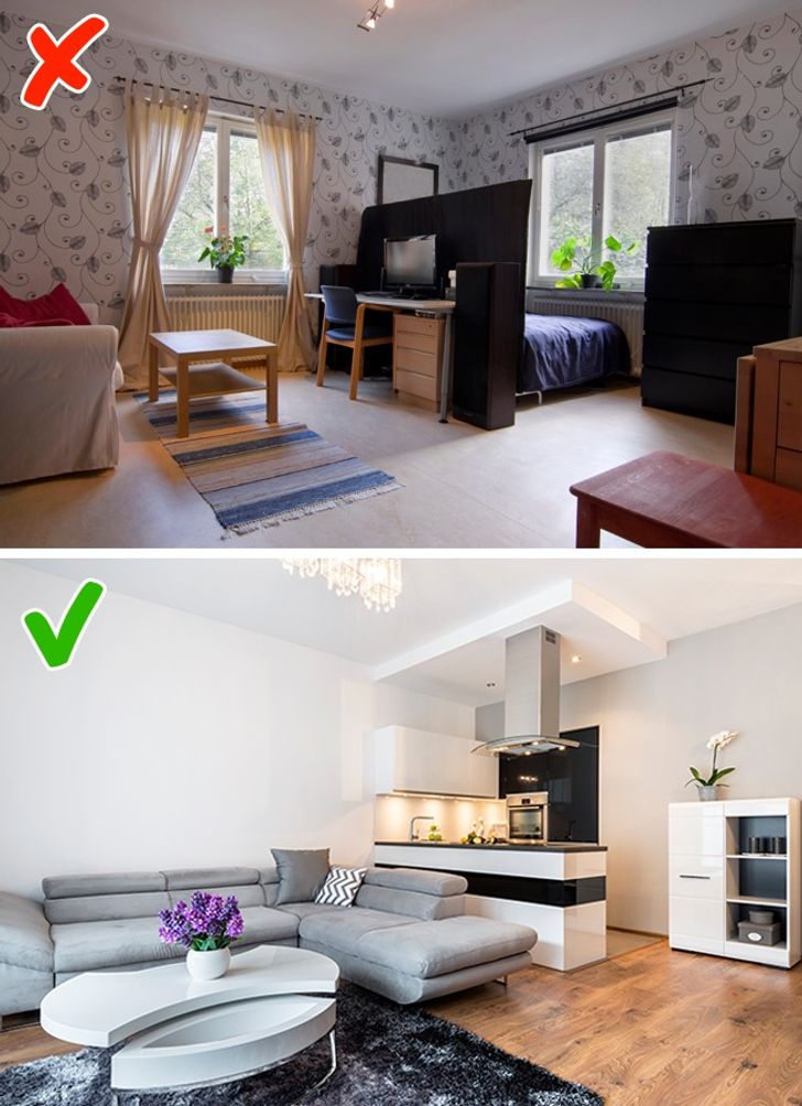 Ένα από τα πιο συνηθισμένα λάθη που κάνουν οι άνθρωποι κατά τη διακόσμηση ενός μικρού χώρου είναι η επιλογή μικρών επίπλων. Στην πραγματικότητα έχει το αντίθετο αποτέλεσμα – δίνει την ψευδαίσθηση ότι ζείτε σε ένα κουκλόσπιτο. Προσθέστε πολλά τεράστια κομμάτια για να διατηρήσετε μια ισορροπία.