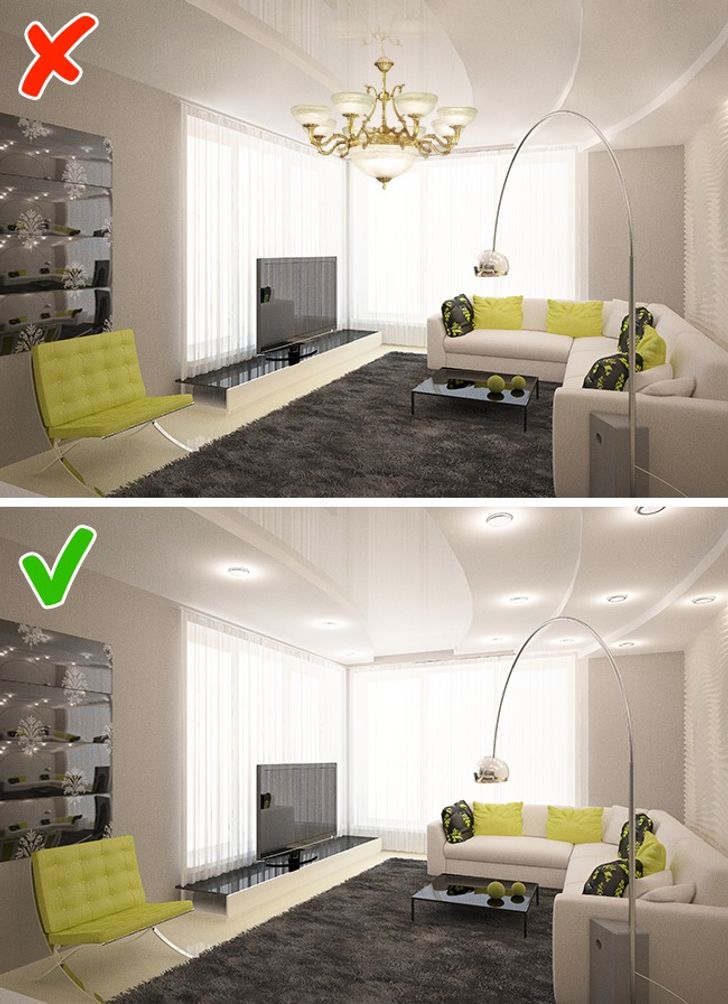 Για να φωτίσετε σωστά το χώρο, μην αγοράζετε τεράστιους πολυελαίους. Επιλέξτε μικρά φώτα στην περίμετρο έτσι ώστε αν δεν έχετε ψηλοτάβανο σπίτι, δε θα αισθάνεστε ότι ο χώρος είναι ασφυκτικός.