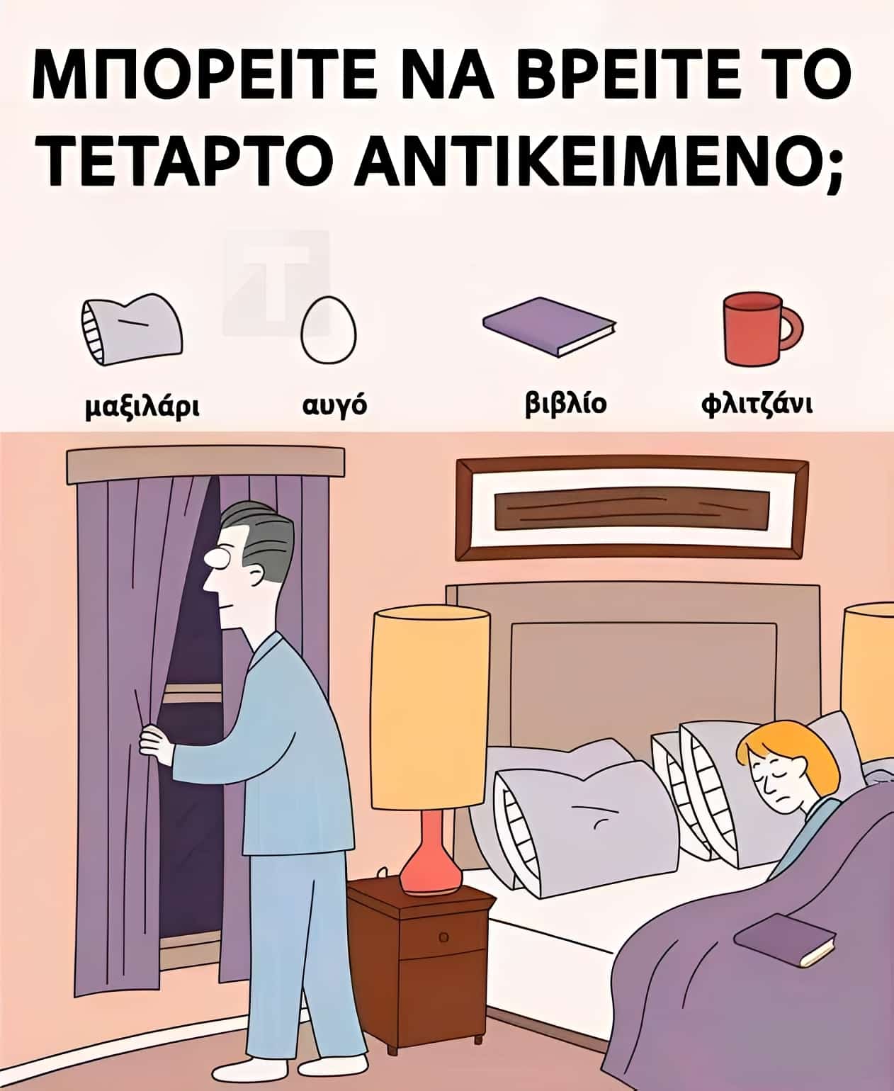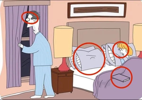 Η εικόνα δείχνει έναν άνδρα να κλείνει τις κουρτίνες του δωματίου, ενώ η γυναίκα είναι ξαπλωμένη ήρεμα. Υπάρχουν αρκετά πράγματα που μπορούν να σε αποσπάσουν από το να βρεις τα αντικείμενα, όπως το φόντο και άλλα στοιχεία που τα κρύβουν άψογα.