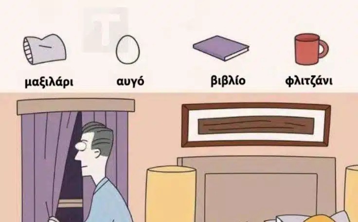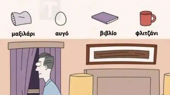 Τα αντικείμενα που πρέπει να βρεις είναι: ένα βιβλίο, ένα αυγό, ένα φλιτζάνι και ένα μαξιλάρι.