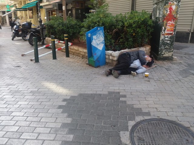 Θλίψη προκαλεί η εικόνα ενός άστεγου πατέρα να κοιμάται αγκαλιά με το ανήλικο παιδί του λίγα μέτρα από το δημαρχιακό μέγαρο του Πειραιά.