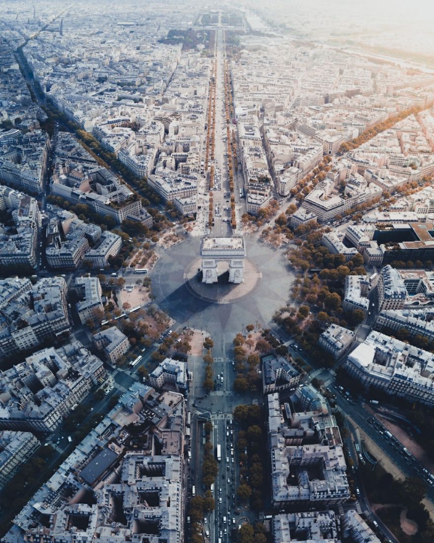 Κάθετη πανοραμική θέα της Αψίδας του Θριάμβου, όπου συναντώνται 12 λεωφόροι.